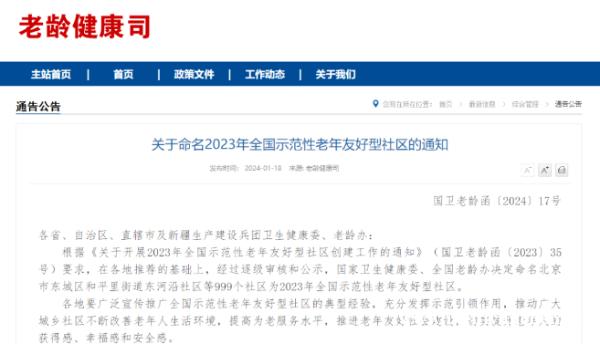 根据《关于开展2023年全国示范性老年友好型社区创建工作的通知》(国卫老龄函〔2023〕35号)要求,在各地推荐的基础上,经过逐级审核和公示,国家卫生健康委、全国老龄办决定命名北京市东城区和平里街道东河沿社区等999个社区为2023年全国示范性老年友好型社区。